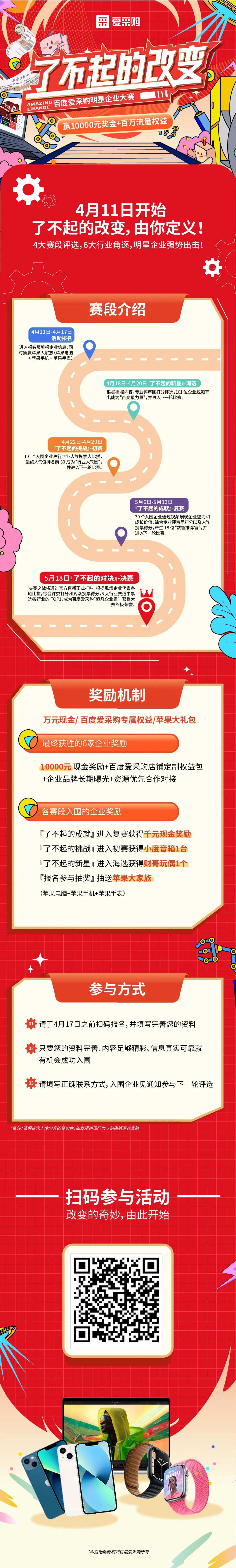 這個春天百度愛采購明星企業(yè)大賽熱血來襲,我們將面向平臺內(nèi)所有店鋪商家開展一場超級評選活動,尋找屬于百度愛采購的明星企業(yè)改變故事,報名參與有機會贏10000元現(xiàn)金、百萬愛采購流量權(quán)益,只要報名填信息就能參與領(lǐng)iPhone大家族!