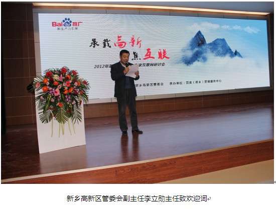 2012年11月7日,在新鄉(xiāng)市高新技術(shù)火炬園綜合研發(fā)樓會(huì)議中心,百度新鄉(xiāng)地區(qū)營銷服務(wù)中心與新鄉(xiāng)市高新區(qū)管委會(huì)會(huì)共同舉辦了 “營銷可以走直線”—2012企業(yè)營銷研討會(huì)暨祝賀新鄉(xiāng)高新區(qū)升級為國家級大會(huì)。新鄉(xiāng)高新區(qū)管委會(huì)副主任李立勛主任、新鄉(xiāng)高新區(qū)經(jīng)濟(jì)發(fā)展局局長李學(xué)軍局長、新鄉(xiāng)高新區(qū)管委會(huì)副主任張地女士、新鄉(xiāng)高新區(qū)創(chuàng)業(yè)服務(wù)中心主任宋麗萍主任、百度公司渠道部西北區(qū)總監(jiān)陳禎鋒先生、青峰網(wǎng)絡(luò)科技有限公司總經(jīng)理余進(jìn)先生等數(shù)十位領(lǐng)導(dǎo)作為嘉賓出席本次會(huì)議。