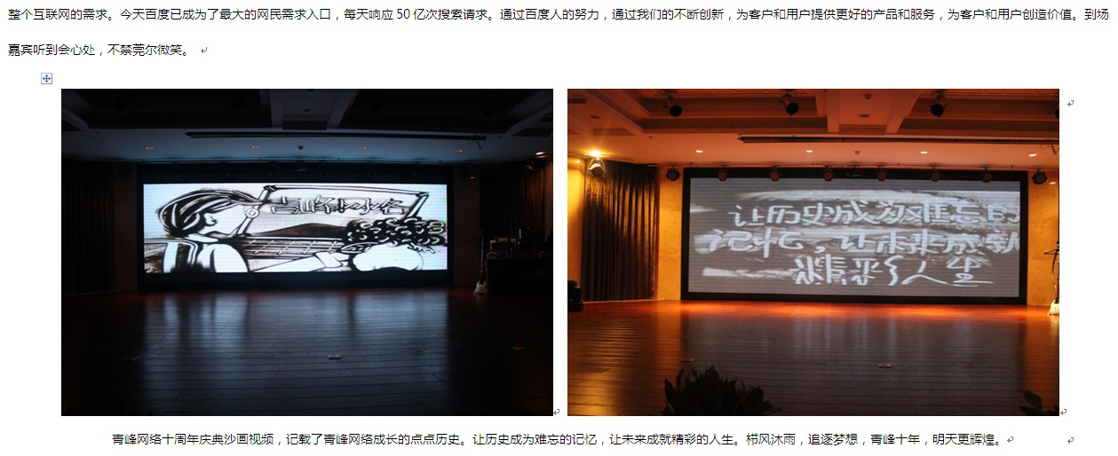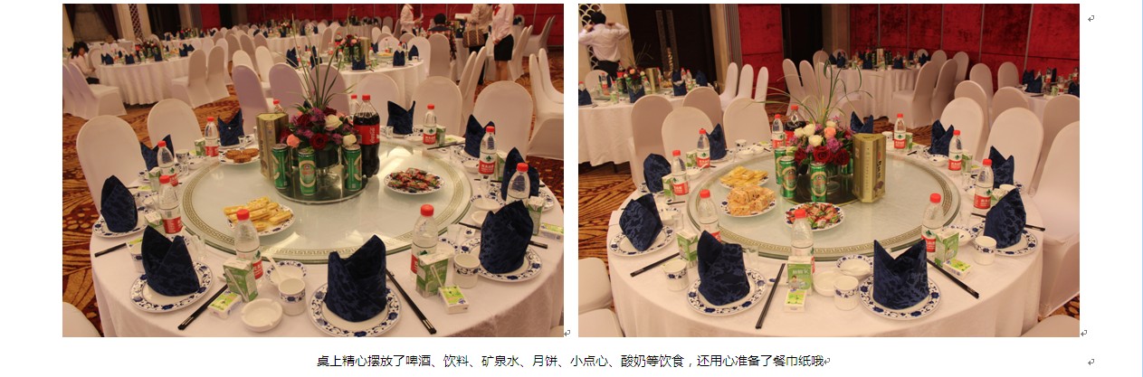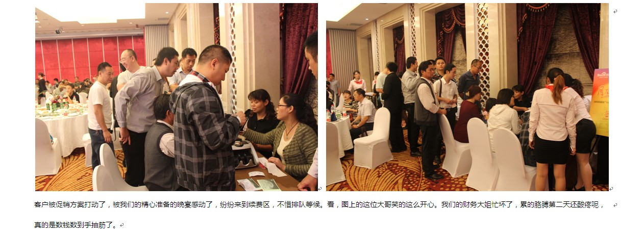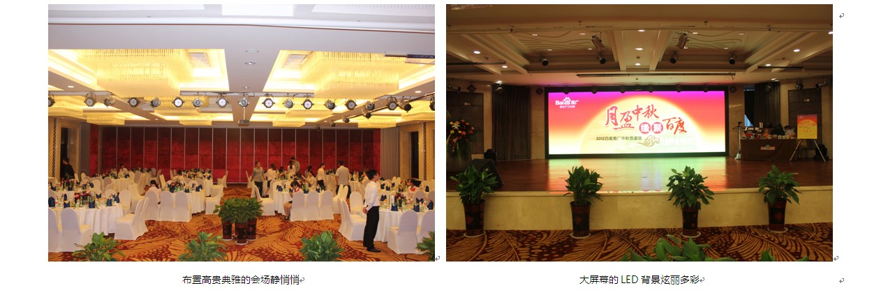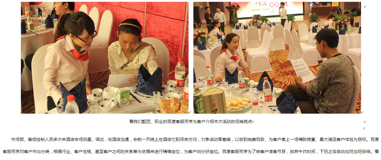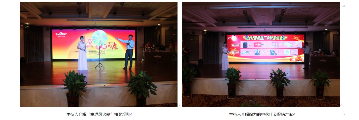 本次活動,舞臺背景使用大屏幕LED,效果絢麗多彩??蛻糇郎暇臄[放了啤酒、飲料、礦泉水、月餅、小點心、酸奶等飲食,還用心準備了餐巾紙。會務(wù)人員安排井然有序,游戲環(huán)節(jié)新穎勁爆,促銷政策激動人心,續(xù)費抽獎火熱爆棚、熱烈的客戶互動、真誠的客戶感言。無論是酒店檔次,舞臺效果還是節(jié)目的精彩程度都讓在場的客戶朋友們充分感受到了新鄉(xiāng)百度人的熱情和真誠。