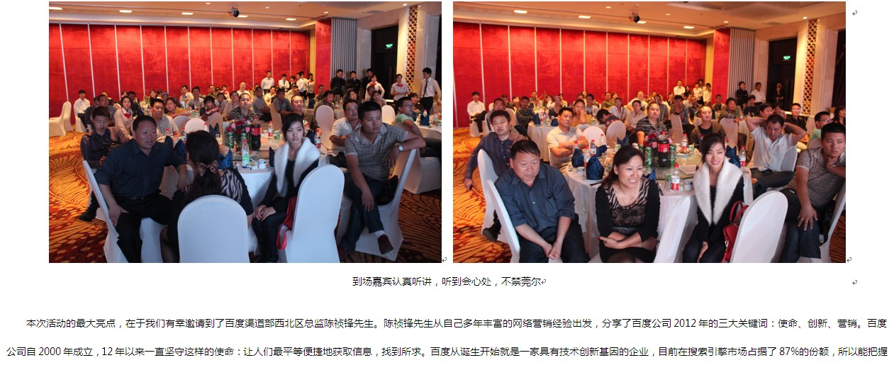 在這個秋月朗照,丹桂飄香的夜晚,我們匯聚四面八方的歡歌笑語,舉辦了一場完美的感恩盛宴。活動現(xiàn)場,新鄉(xiāng)企業(yè)家朋友按捺不住他們與百度合作的熱情,紛紛與自己的百度客服人員分享百度推廣的心得體會,甚至與我們的百度客服同事聯(lián)袂登臺獻歌,表達自己的感激之情。一曲《執(zhí)著》,一曲《兄弟》,表達了對百度推廣的“執(zhí)著之心”,與百度推廣的“兄弟之情”。