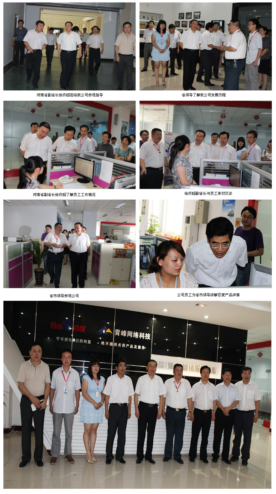 2012年7月12日,在新鄉(xiāng)市市委書(shū)記李慶貴、市長(zhǎng)王戰(zhàn)營(yíng)、高新區(qū)管委會(huì)主任王兵法、書(shū)記劉慶貴等相關(guān)領(lǐng)導(dǎo)的陪同下,河南省副省長(zhǎng)徐濟(jì)超帶隊(duì)的省企業(yè)參觀團(tuán)一行,蒞臨新鄉(xiāng)市青峰網(wǎng)絡(luò)科技有限公司參觀指導(dǎo),徐濟(jì)超副省長(zhǎng)詳細(xì)詢問(wèn)了我公司發(fā)展歷程,企業(yè)規(guī)模等情況,與公司員工親切交談,并提出省市各級(jí)政府今后工作中將“突出企業(yè),企業(yè)為先”幫助企業(yè)不斷發(fā)展,對(duì)青峰網(wǎng)絡(luò)科技有限公司的發(fā)展、進(jìn)步表示贊許與鼓勵(lì)。